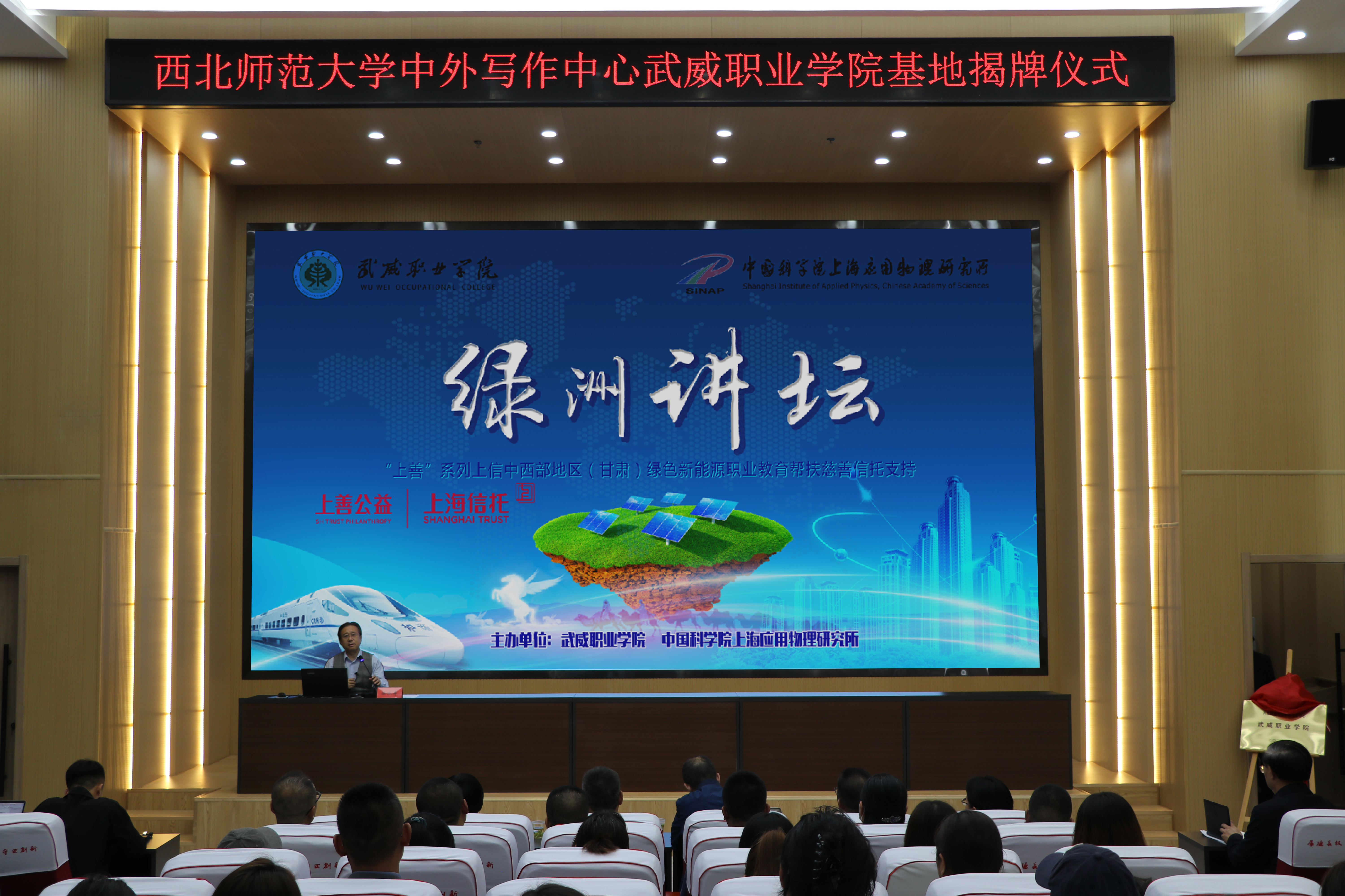 西北師范大學中外寫作中心常務副主任徐兆壽教授,中國日報社甘肅記者站馬靜娜站長,涼州文化研究院院長張國才、武威職業(yè)學院所有校領(lǐng)導、中層干部及師生代表參加揭牌儀式及報告會?;顒佑晌渫殬I(yè)學院黨委書記王宏主持,武威職業(yè)學院黨委副書記、校長張開禮代表學校致辭。