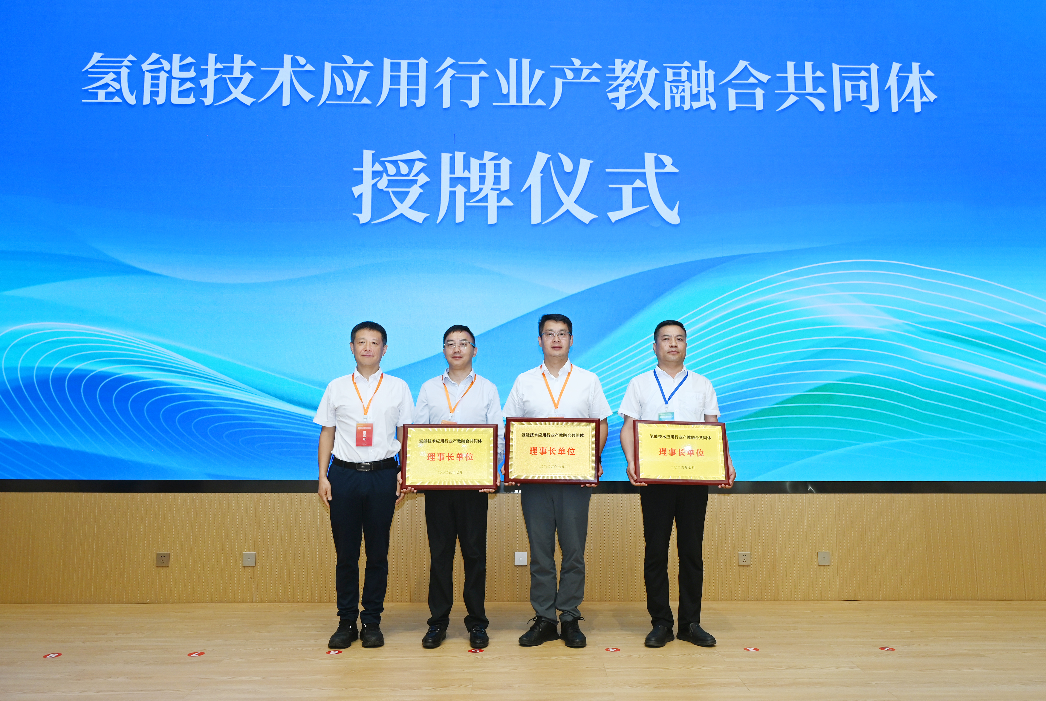 啟動儀式上,與會領導共同點亮啟動球,宣布氫能技術應用行業(yè)產教融合共同體正式成立。大會公布了共同體理事會成員單位名單,并為理事長單位、副理事長單位授牌。