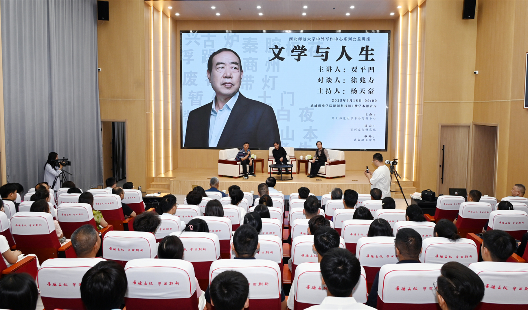 近日,西北師范大學(xué)中外寫(xiě)作中心武威基地“文學(xué)與人生”公益講座在武威職業(yè)技術(shù)大學(xué)舉辦。著名作家、西北師范大學(xué)特聘教授賈平凹擔(dān)任主講嘉賓,寫(xiě)作中心常務(wù)副主任徐兆壽教授擔(dān)任對(duì)談嘉賓,與師生共赴一場(chǎng)思想文化盛宴。講座由西北師范大學(xué)中外寫(xiě)作中心副主任楊天豪主持。