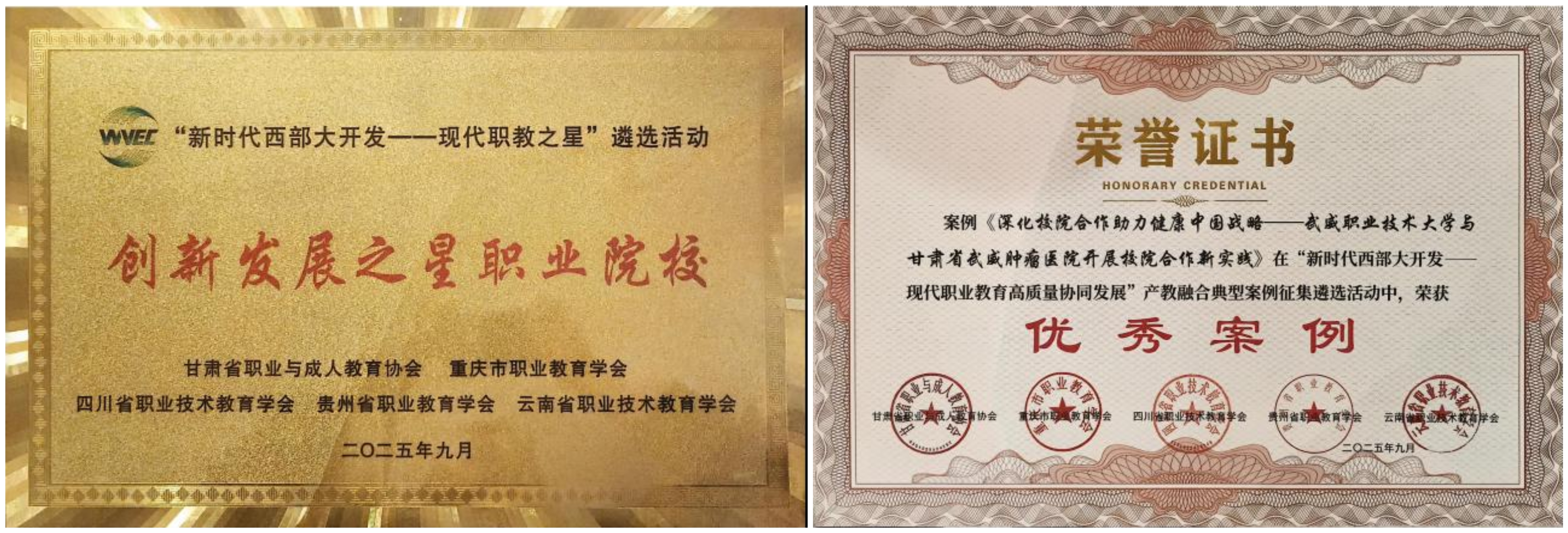 近日,從“新時代西部大開發(fā)——現(xiàn)代職業(yè)教育高質(zhì)量協(xié)同發(fā)展(蘭州)大會”上傳來喜訊,武威職業(yè)技術大學在甘肅省職業(yè)與成人教育協(xié)會組織的“新時代西部大開發(fā)——現(xiàn)代職教之星”和“新時代西部大開發(fā)——產(chǎn)教融合典型案例”征集遴選活動中榮獲兩項重要榮譽。學校獲評“創(chuàng)新發(fā)展之星職業(yè)院?!?,《深化校院合作助力健康中國戰(zhàn)略——武威職業(yè)技術大學與甘肅省武威腫瘤醫(yī)院開展校院合作新實踐》榮獲“產(chǎn)教融合典型案例優(yōu)秀案例”。